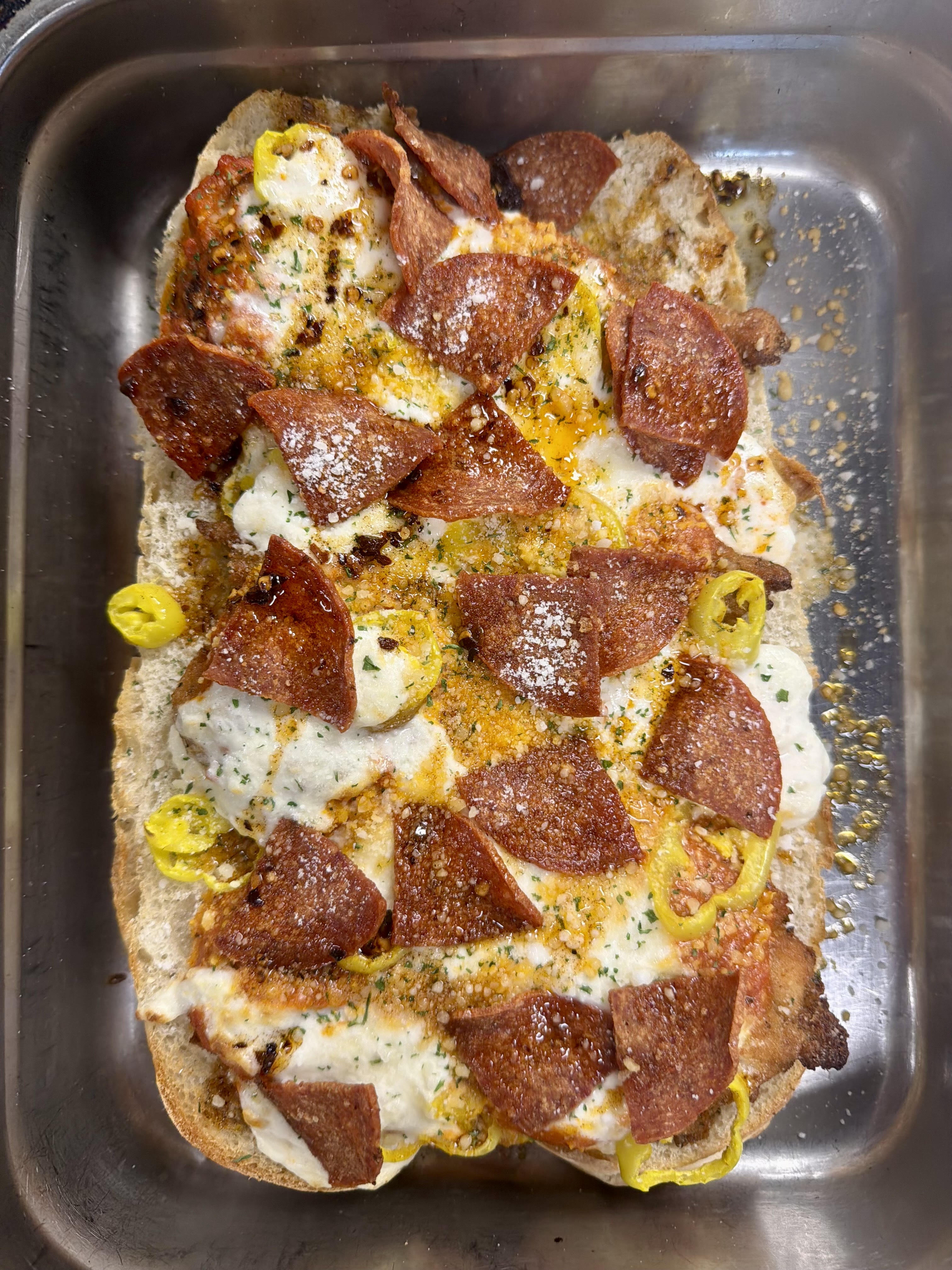 Introducing "La Pizza Parme" - Cardona's twist on a classic dish, served open faced and featuring a Nino’s freshly baked roll, Cardona’s chicken cutlets, Housemade chili oil, house vodka sauce, banana peppers, Stracciatella cheese, Parmigiana Reggiano, & Crispy Pepperoni.
